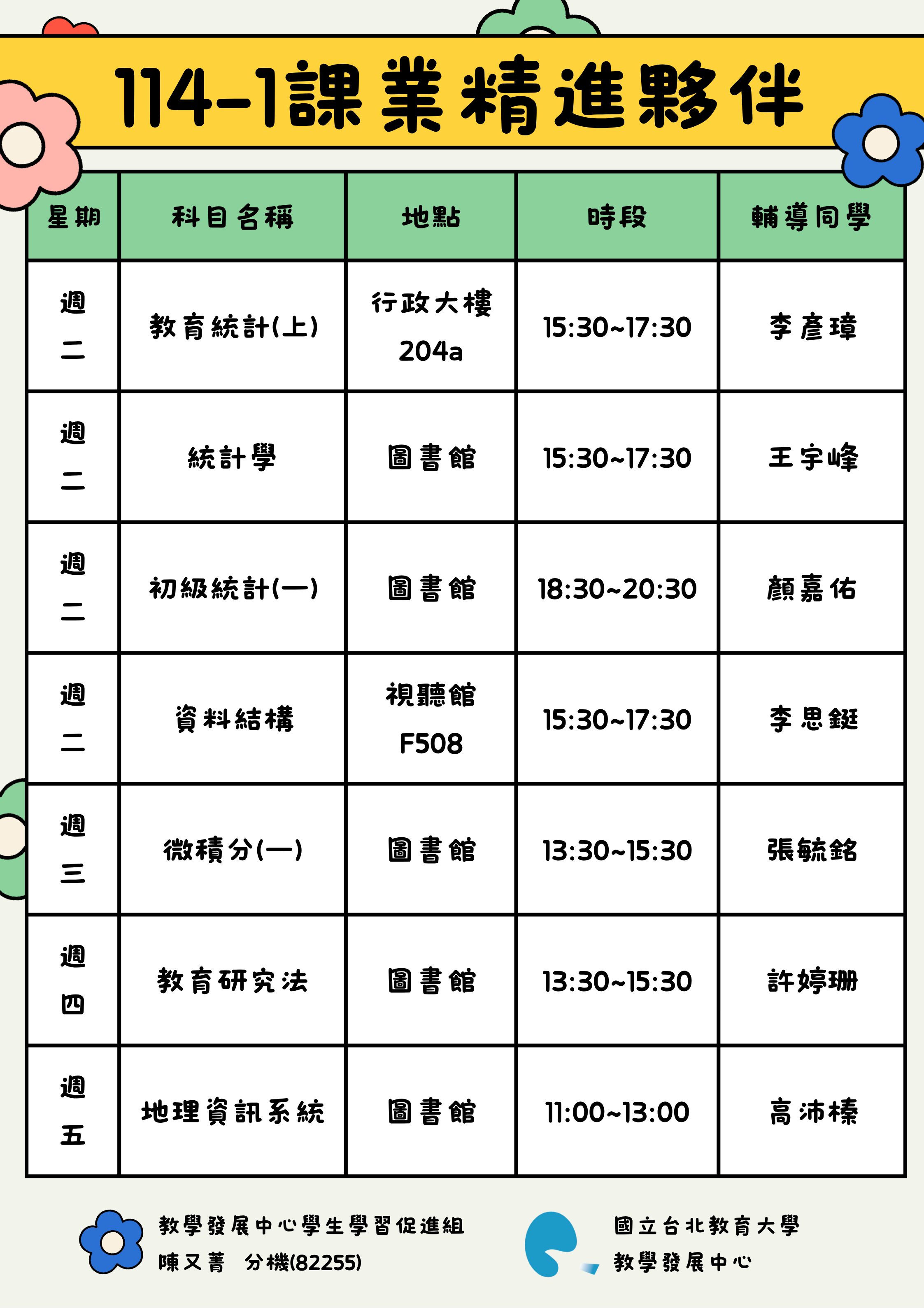 【公告】114學年度第1學期課業精進夥伴服務時段